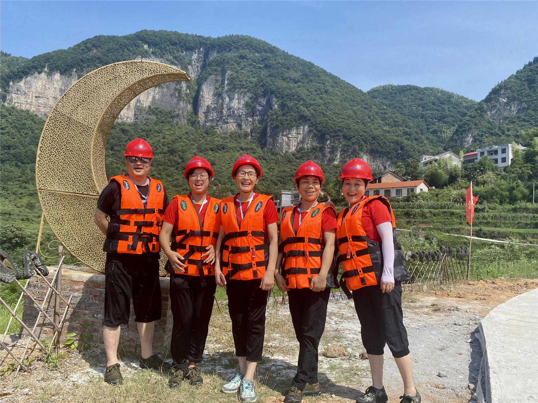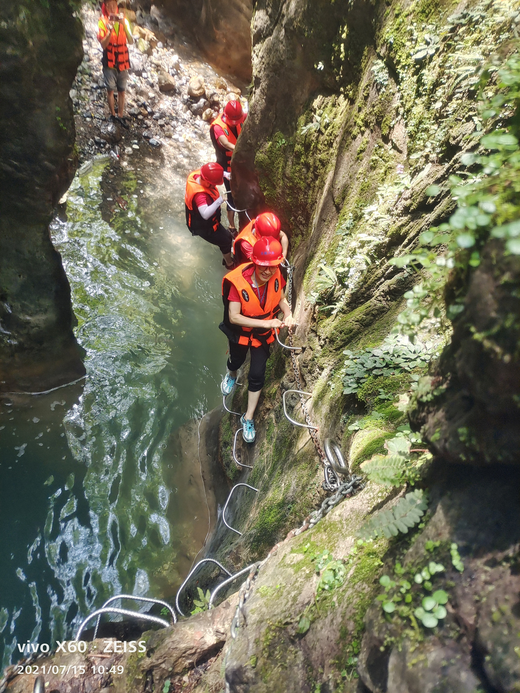 調研組一行在公司安全員的帶領下,踏水而行,逆流而上,沿途山林聳立、溪水潺潺,踩著輔助階梯爬上陡峭的石壁,拉著繩索淌過水深及腰的險潭,一行人互幫互助,步履堅定,向終點邁進。