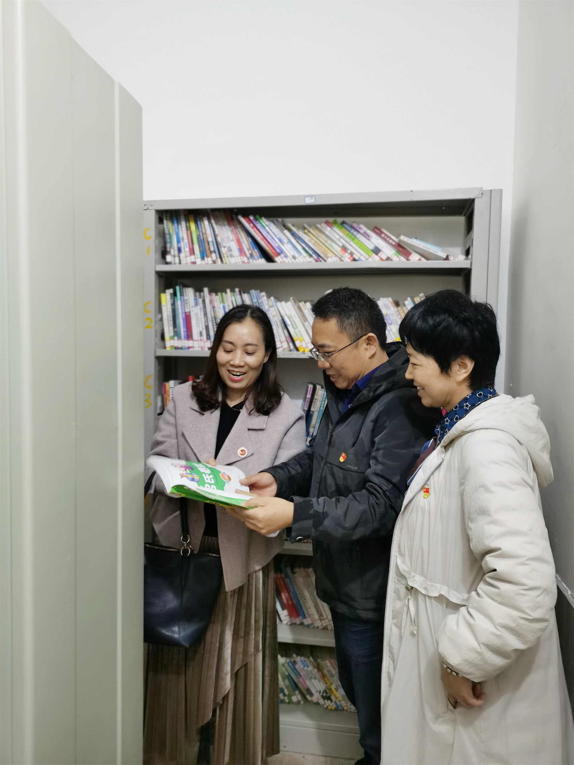 謝四連(左1)等查看圖書閱覽室