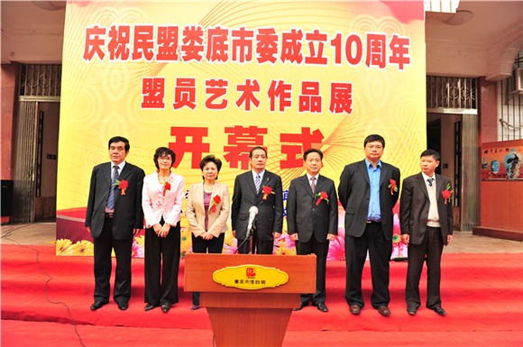 民盟婁底市委自2000年5月成立已經10年了。10年來,在民盟湖南省委和中共婁底市委的正確領導下,婁底民盟團結和帶領全市廣大盟員,緊扣婁底工作大局,積極參政議政、建言獻策,服務社會,做了大量卓有成效的工作,先后榮獲民盟中央頒發的 “全國基層組織建設先進單位”、“中國民主同盟盟務工作先進集體”、民盟省委頒發的“全省先進地方組織”等光榮稱號。為進一步激發廣大盟員對民盟的熱愛,傳承民盟優良傳統,更好地為婁底經濟社會發展服務,民盟婁底市委采取“三個一”慶祝婁底民盟成立十周年。即編輯一本畫冊、表彰一批先進、舉辦一次盟員藝術作品展。全國政協常委、民盟湖南省委主委楊維剛,婁底市政協主席楊云輝,中共婁底市委副書記田福德,中共婁底市委常委、統戰部部長肖新桃,婁底市政協副主席、民盟婁底市委主委邵瑛,市政協副主席、民盟婁底市委副主委肖揚等領導出席畫冊首發式和畫展開幕式,并為獲獎者頒獎。