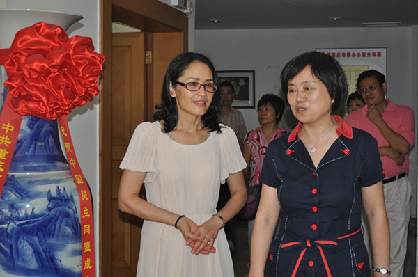 韓建敏(前右)陪邵瑛(前左)等參觀民盟重慶市委機關