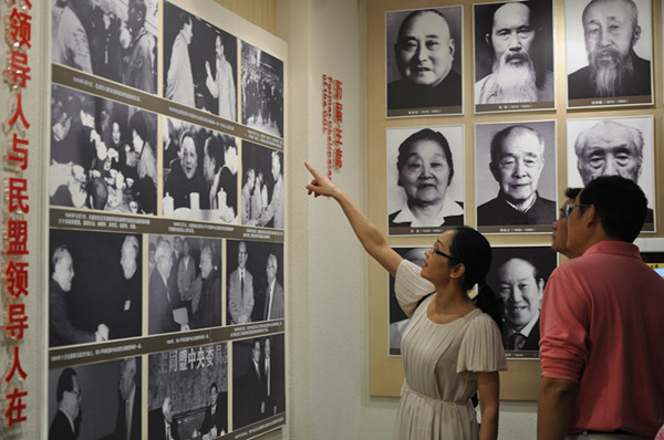 邵瑛(左)在中國民主黨派歷史陳列館為考察團成員講解民盟歷史