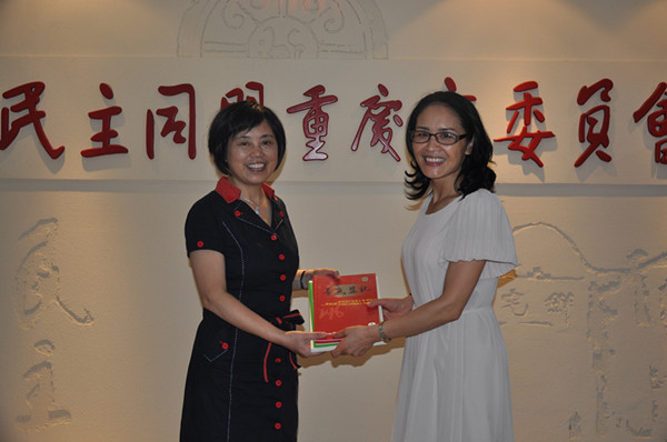 邵瑛(右)向民盟重慶市委專職副主委韓建敏贈送《婁底盟訊》