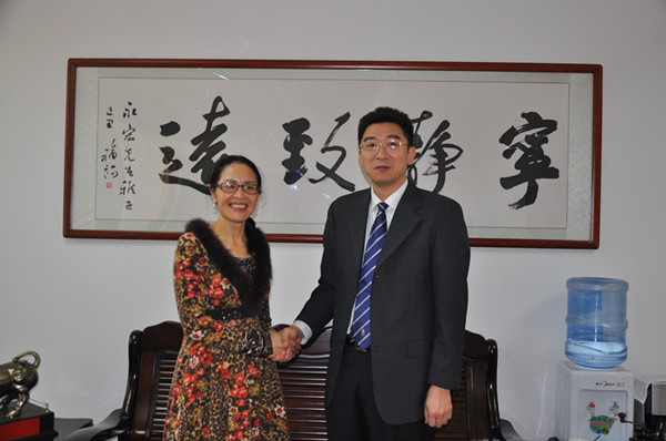 惠州學(xué)院院長(zhǎng)彭永宏(右)在院長(zhǎng)辦公室親切會(huì)見婁底市政協(xié)邵瑛副主席(左)