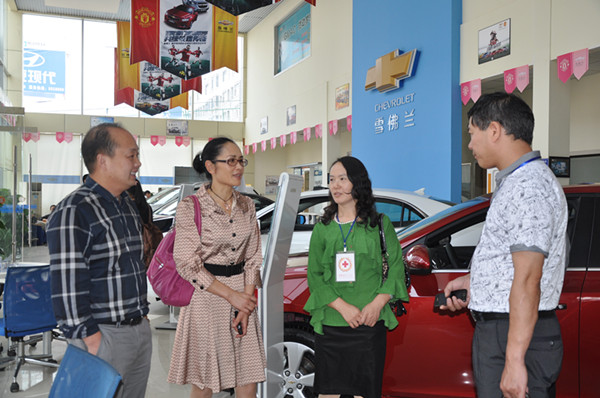 邵瑛(左2)等聽取潘杰(左1)關于雪佛蘭等汽車品牌的介紹