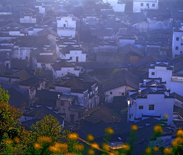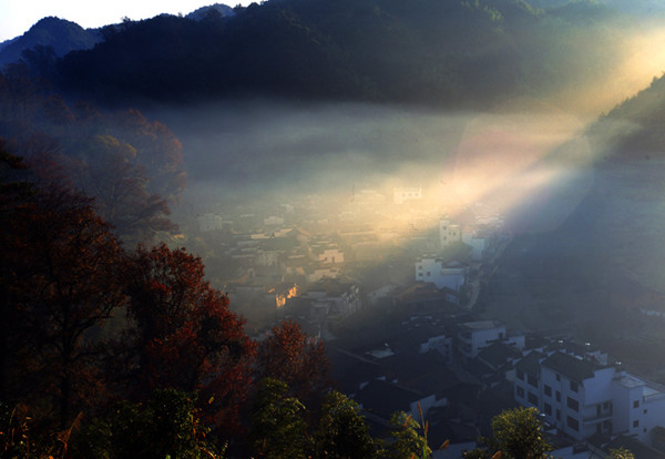 身處喧囂的塵世,找一寧靜之地,渴望清新淡雅的靜謐,讓秋日的陽光撫摸自由跳躍的心靈,讓飄落的紅葉掠去心頭的浮躁,真正領(lǐng)略寧靜,淡淡的秋陽下,安詳寂靜,唱著歌走著山路,坐在河邊看美麗倒影。日出之前,陣陣雞鳴,日出之后,炊煙裊裊,流走日月,沉淀心情。渾白色的村莊,綠色的山丘和田野,溝底的小河,黃黃的油菜花,構(gòu)成春天的五彩繽紛。山水渲染,蒙黃色、樸色、豐收的笑靨、環(huán)山澗水的徽派古村落與這些色調(diào)相若,勾勒成一張張?zhí)烊撕弦坏漠嬀?,勾勒成秋天的絢麗多彩。這就是讓人們心醉的婺源。
