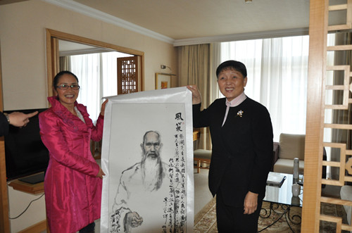 為慶祝民盟第十一次全國代表大會勝利召開,民盟婁底市委文化藝術委員會主任、湖南人文科技學院教授、著名畫家羅湘科創(chuàng)作《風范》(民盟前輩張瀾主席畫像)。會議期間,邵瑛代表向張梅穎副主席敬贈了羅湘科畫作,并匯報了婁底民盟近年來的工作。