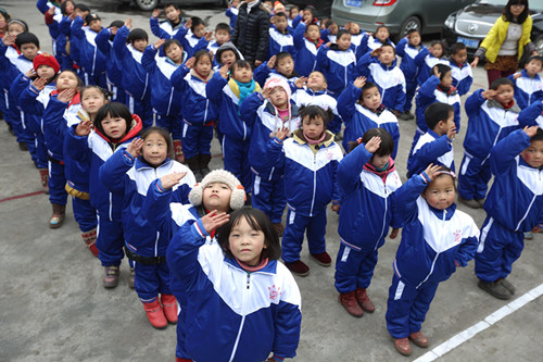 惠民學校的學生穿上婁底宇森汽貿贈送的新校服參加升旗儀式 。