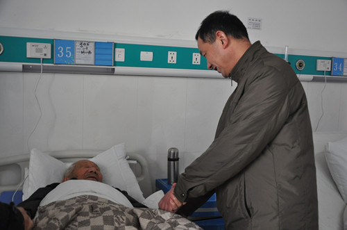 躺在病床上的老盟員梁兆龍拉著羊小慶的手,久久不愿放開,他說出了老盟員們的共同心聲,感謝組織關心,作為民盟人,很幸福。