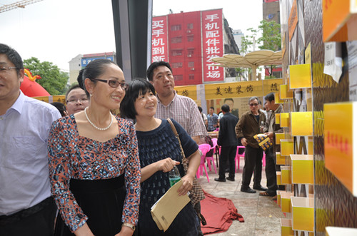 邵瑛(左1)與羅湘科(左3)、鄔小明(左2)等品鑒藝術建材