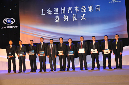 上海通用汽車公司總經理王曉秋(左5)、副總經理(蔡斌右1),與此次簽約的全國10家凱迪拉克經銷商代表潘杰(右5)等合影。 邵瑛攝影