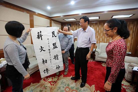 2013年9月,鄔小明(左)向全國人大常委會副委員長、民盟中央主席主席張寶文(右2)