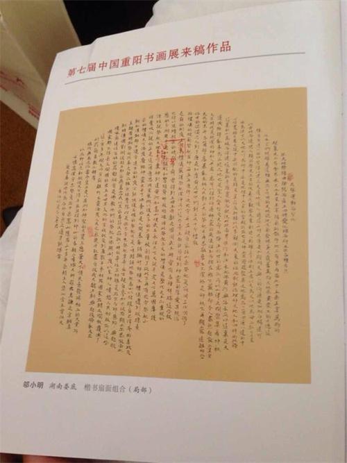 鄔小明老師是當代著名的楷書大家鄔惕予老先生的女兒。鄔老的書法被書法界稱為“鄔體書法”又名“鄔惕予書法”。鄔小明老師自幼隨父臨池,探訪歷代名家書帖,在鄔體的繼承和發展上取得可喜成就。鄔小明行書頗具靈性,小楷精到而有古意,草書潑辣大膽。她此次選送的作品是楷書扇面組合。該作品還是唯一一幅放此次活動指南上的作品。