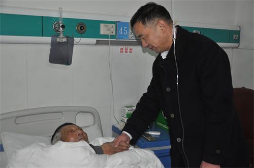 羊小慶(右)到醫院看望老盟員梁兆龍(左)