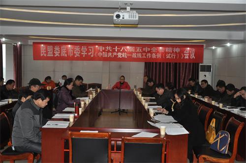 2016年1月13日,民盟婁底市委召開市委擴大會議,這是2016的第一次市委會議。會議集中學習了中共十八屆五中全會、《中國共產黨統一戰線條例(試行)》和《關于加強政黨協商的實施意見》等文件精神。婁底市政協副主席、民盟婁底市委主委邵瑛主持會議,并做輔導講話。盟市委副主委羊小慶、朱宏志、肖建泳出席會議。在婁市委委員,市直支部主委,省市人大代表、政協委員共40余人參加會議。