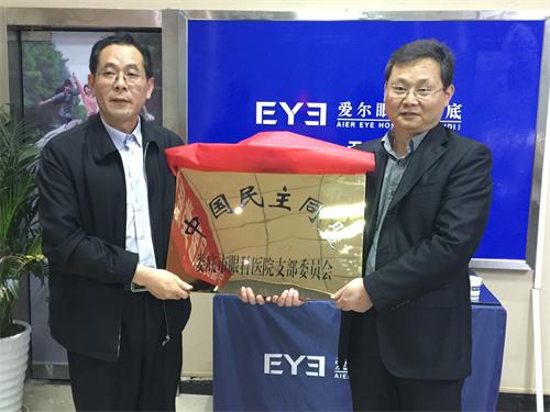 肖建泳代表民盟婁底市委向民盟婁底眼科醫院支部授牌、授印。