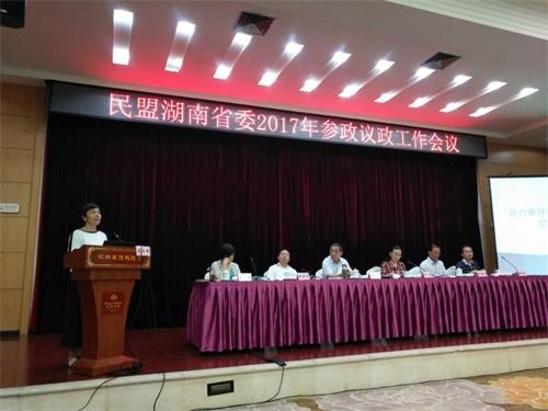民盟湖南省委2017年參政議政工作會議于8月24日至25日在長沙召開。省政協副主席、民盟湖南省委主委楊維剛出席會議并講話。民盟湖南省委專職副主委胡穎,副主委何寄華、楊君武、戴曉鳳、黎定軍,副巡視員鄒衛,秘書長劉春陽出席會議。胡穎主持開幕會,戴曉鳳作參政議政工作報告。