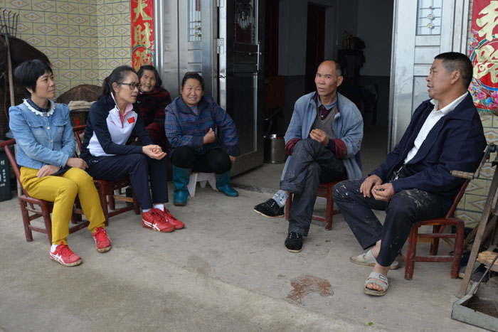 邵瑛(左2)與貧困戶和扶貧專干座談