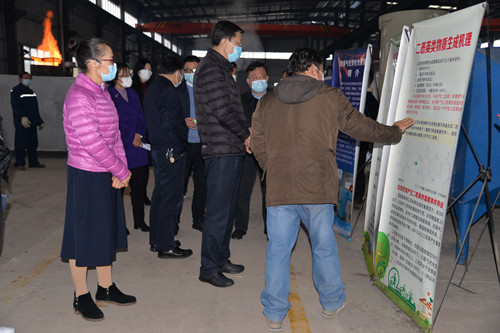 陳慶平(右1)向劉非(右3)介紹小型垃圾氣化裂解燃燒爐應(yīng)用情況