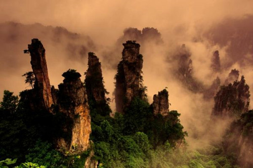 我喜歡在陽光明媚日子里的清晨黃昏,離開喧鬧的城市,離開塵世的紛憂。迎著暮色蒼茫,迎著朝陽晨曦,驅(qū)車來到武陵源的山上,讓輕拂的清風(fēng)吹走滿身塵埃;讓喚醒大地的晨曦洗滌心靈污垢;讓心靈的夢想溶入如血的殘陽;讓思想的靈魂似光芒四射的晨光;讓孤獨(dú)的靈魂象低旋的歸鴉,似炊煙飄忽。