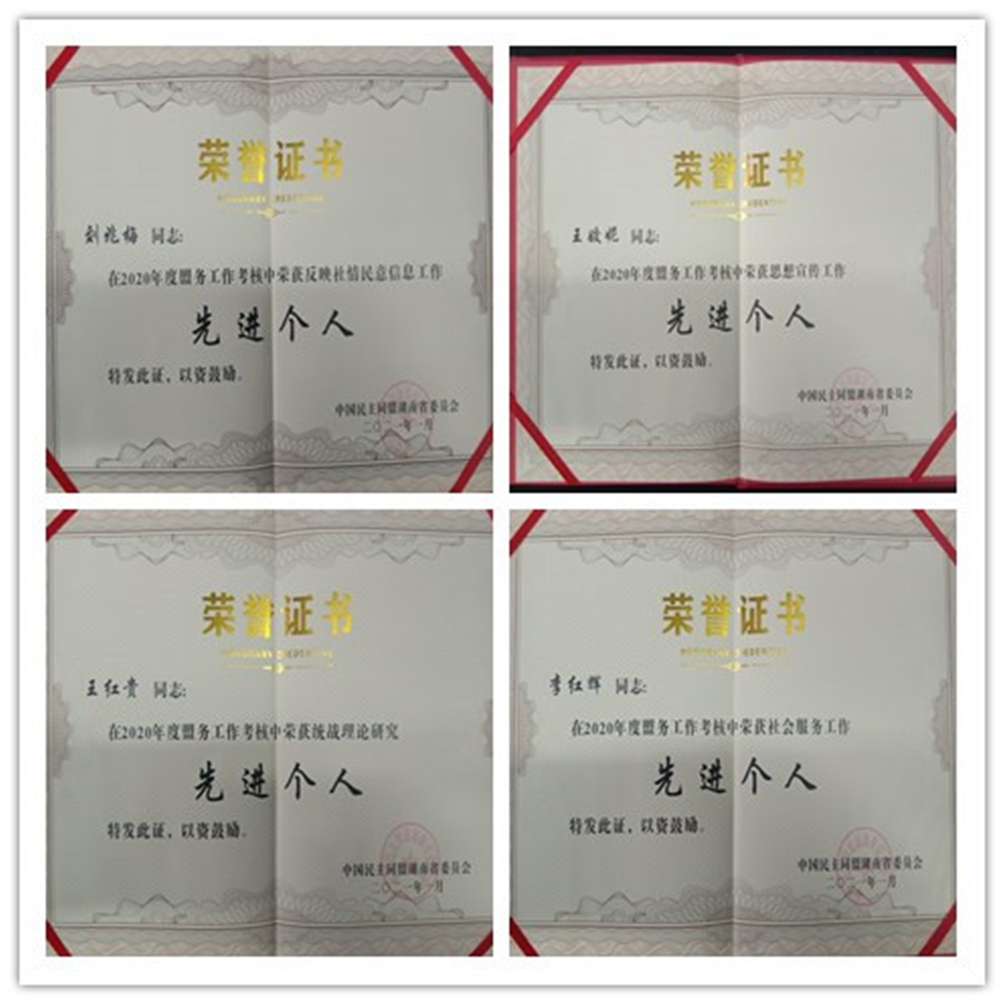 會議總結(jié)了2020全省盟務(wù)工作,對2021年盟務(wù)工作進行了部署,表彰了2020年度盟務(wù)工作專項考核中表現(xiàn)突出的先進集體和先進個人。民盟婁底市委會榮獲5項先進集體表彰,分別為“民盟湖南省委會2020年度盟務(wù)工作考核先進集體(綜合獎)”“民盟湖南省委會2020年參政議政工作先進集體”“民盟湖南省委會2020年度反映社情民意信息工作先進集體三等獎”“民盟湖南省委會2020年度組織工作先進集體”“民盟湖南省委會2020年度思想宣傳工作先進集體”劉兆梅榮獲“民盟湖南省委會2020年度反映社情民意信息工作先進個人”,王姣妮榮獲“民盟湖南省委會2020年度思想宣傳工作先進個人”,王紅貴榮獲“民盟湖南省委會2020年度統(tǒng)戰(zhàn)理論研究優(yōu)秀個人”,李紅輝榮獲“民盟湖南省委會2020年度榮獲社會服務(wù)工作先進個人”。