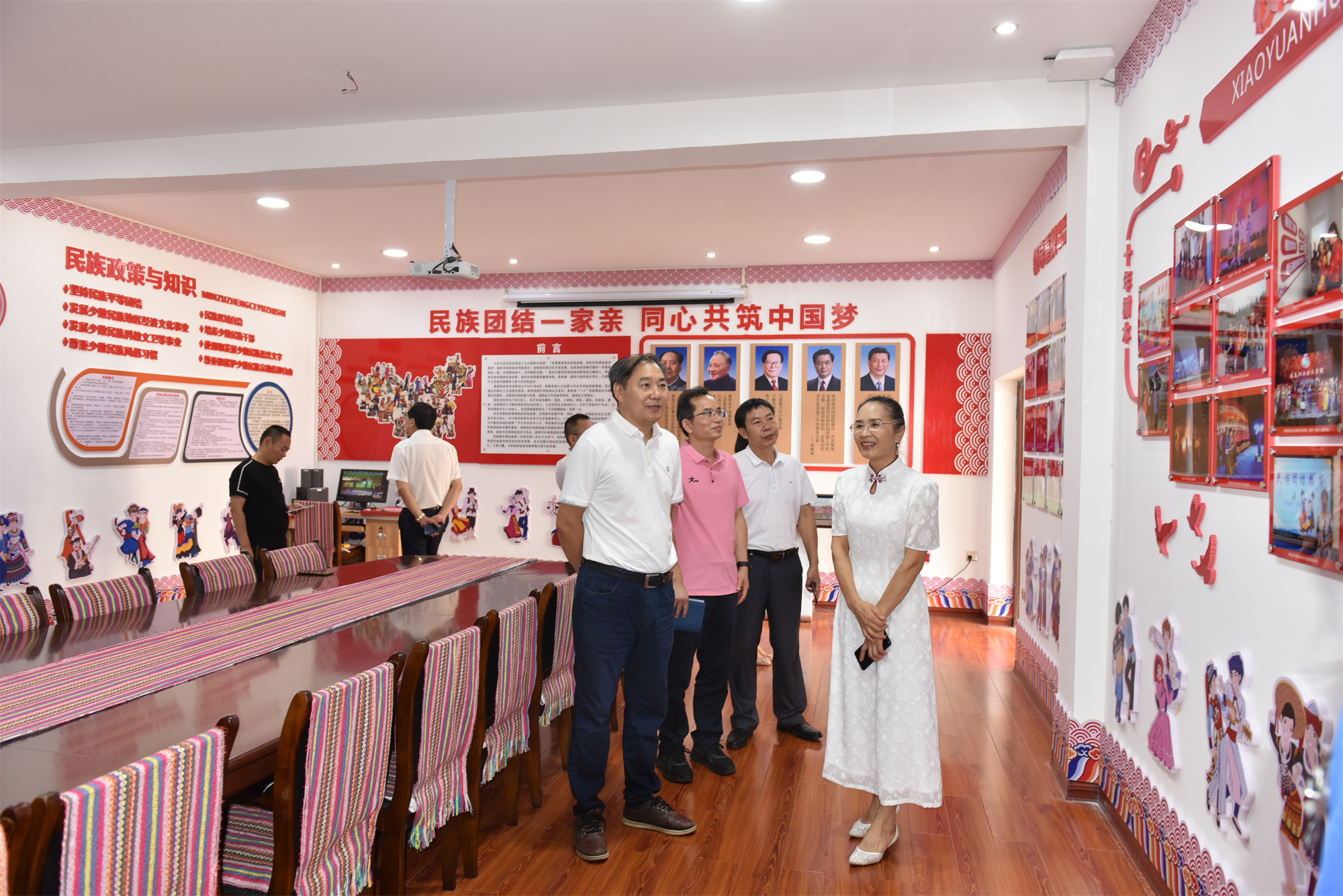 朱忠義(左1)、張征瀾(左2)陪同邵瑛(右1)參觀民族團結進步教育展覽館
