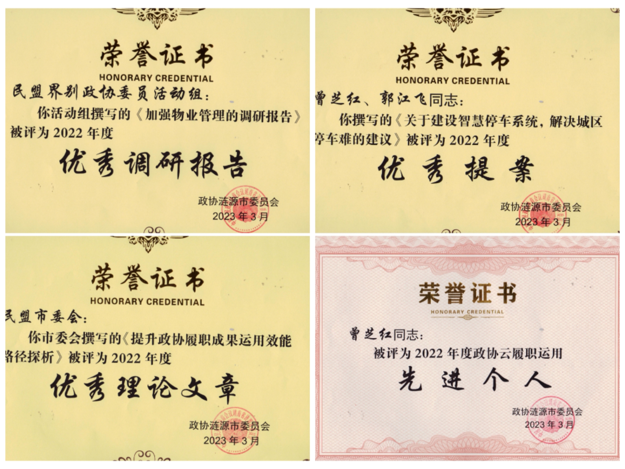 會議期間,盟員委員積極發揮界別特色,以飽滿的熱情和高度的政治責任感,積極參與聯組座談討論,踴躍建言獻策,充分展現了民盟委員們心系大局、情系民生的良好形象,共提交提案8件。肖建強等一批優秀委員憑借2022年度的積極作為、出色表現,多次被大會提及和表彰。在優秀提案、調研報告、社情民意信息、大會發言等方面均有突出表現,發出了民盟好聲音,展現了民盟好作為。民盟界別政協委員活動組榮獲“先進集體”稱號,撰寫的《提升政協履職運用效能路徑探析》榮獲“2022年度優秀理論文章”,撰寫的《加強物業管理的調研報告》榮獲“2022年度優秀調研報告”。民盟漣源市委會專職副主委肖建強被評為“2022年度優秀政協委員”,撰寫的《關于在我市開展農村合作經營路徑探索的建議》被評為“2022年度優秀提案”,撰寫的《嚴格落實物業承接查驗,構建和諧物業—業主關系》《整治學校周邊違規租售手機行為刻不容緩》被評為“2022年度優秀社情民意信息”。漣源市政協四級調研員、民盟漣源市委會副主委曾芝紅撰寫的《關于建設智慧停車系統,解決城區停車難的建議》被評為“2022年度優秀提案”。曾芝紅、劉慧雄、廖春南、廖澤林、潘萌、匡合群、吳秋平等七名盟員榮獲“2022年度政協云運用先進個人”。