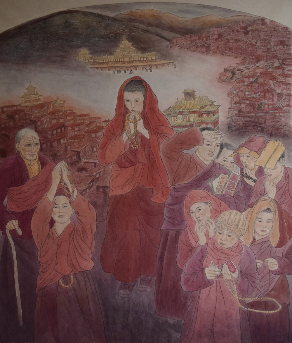 作品簡介:畫作以色達依山而建的密集紅色房子為背景,突出生活在這里的覺姆一家老中青三代,覺姆是這紅色當中的另一抹艷麗。盡管她們生活在貧瘠苦寒之地,但她們臉上洋溢的滿足與平和讓人羨慕。早上的朝陽如黨的關懷,溫暖著色達人們。