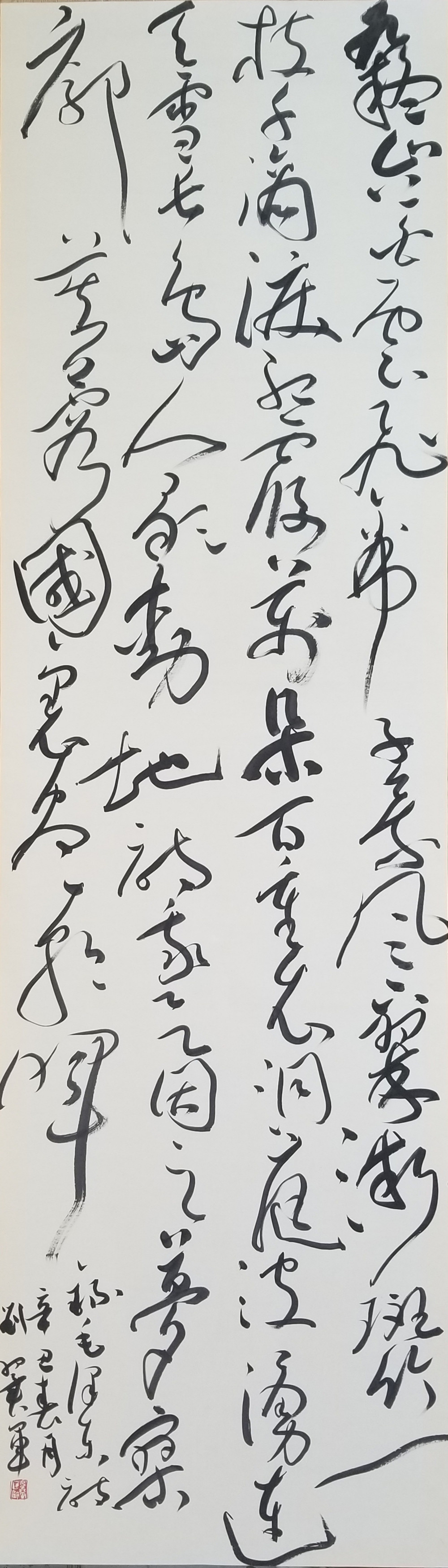 作品簡介:用大草書毛澤東《七律?答友人》詩,以魏晉“二王”的法度揮寫,以求筆墨生動清新,豪邁灑脫,浪漫恣肆的面貌。作品描述了詩人夢回芙蓉盛開、朝霞滿天的家鄉,暢想新中國洶涌的建設社會主義的熱浪,在洞庭湖畔、橘子洲頭翻卷起一曲感動天地的頌歌,響徹湘江大地。