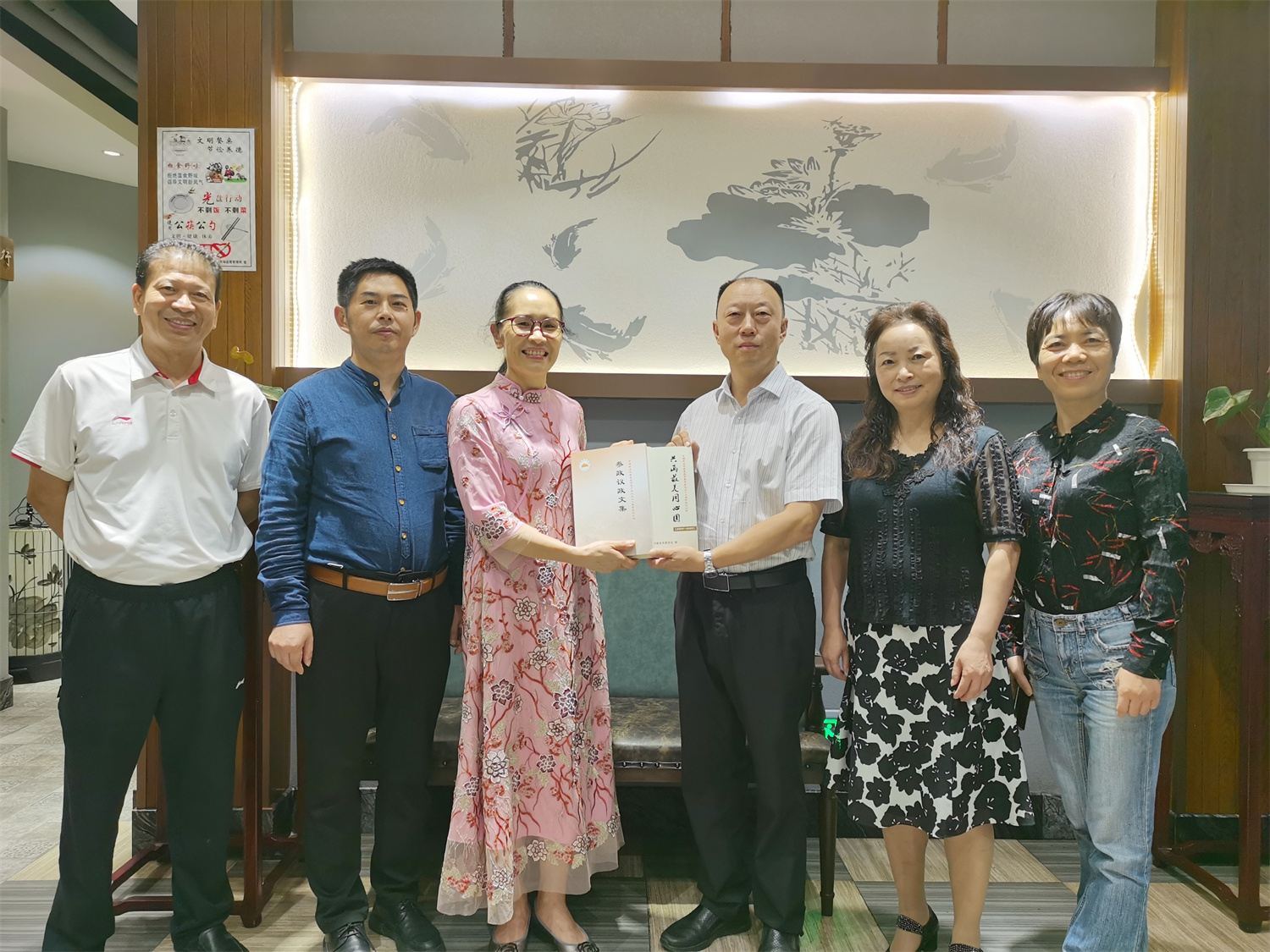 傅小松(右4)代表民盟婁底市委向民盟六盤水市委贈送《共畫最美同心圓》《參政議政文集》