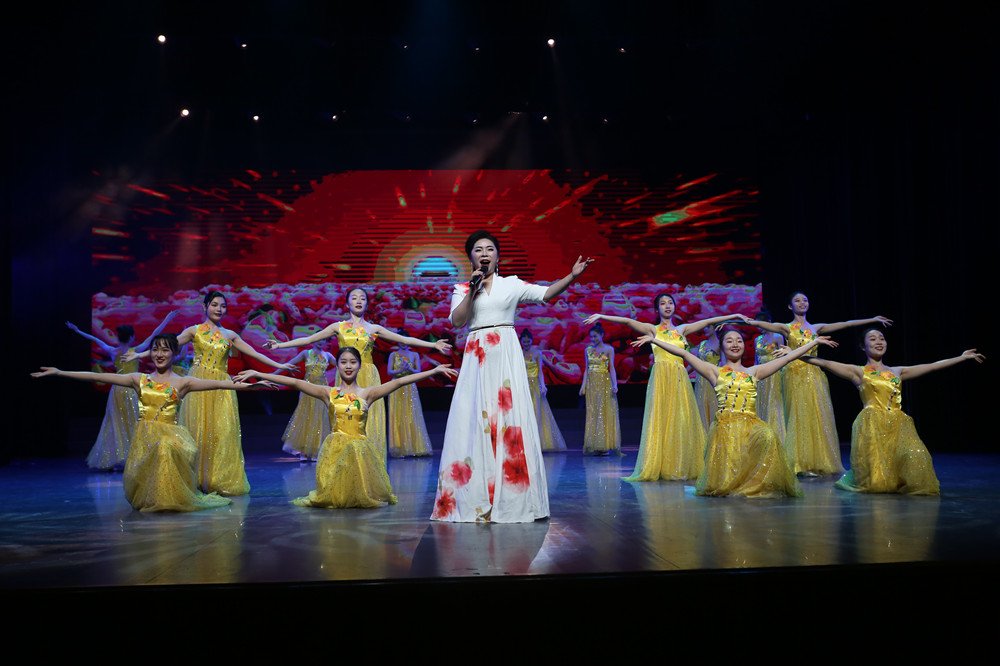 盟員吳健(中)指揮、易毅(左)、鐘艷(右)領唱、民盟婁底技師學院支部表演的大合唱《我的祖國》
